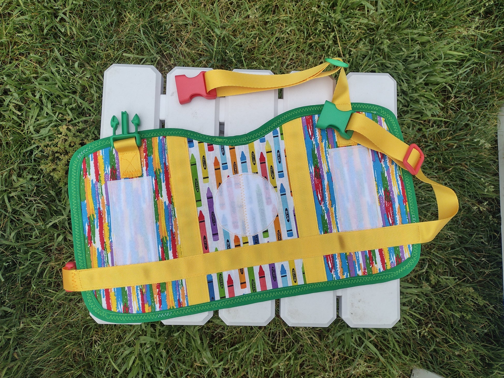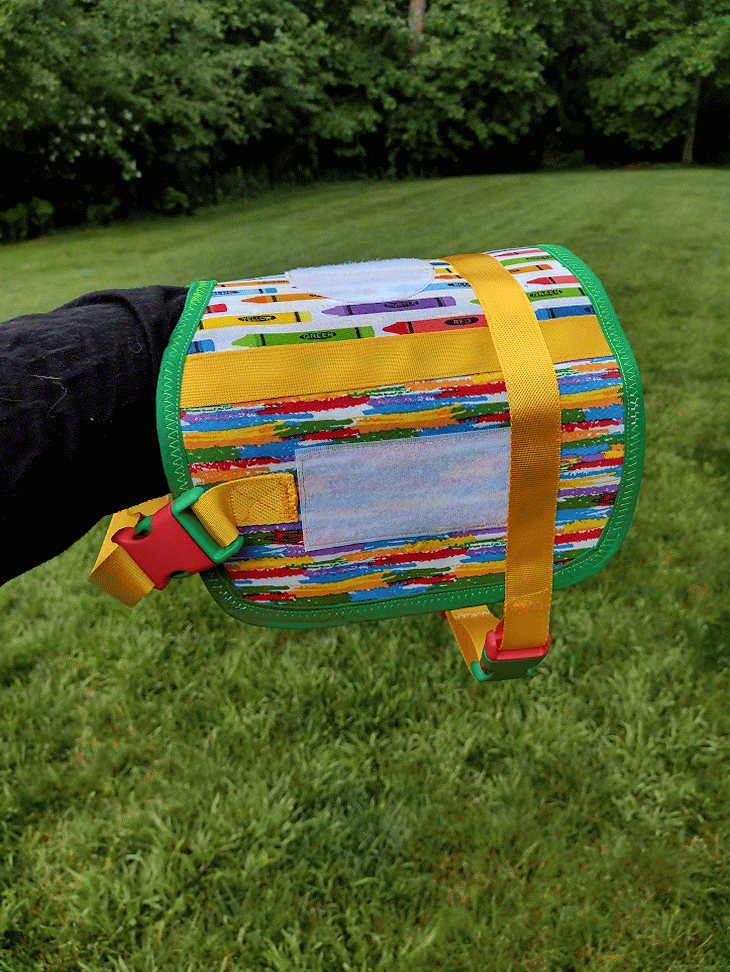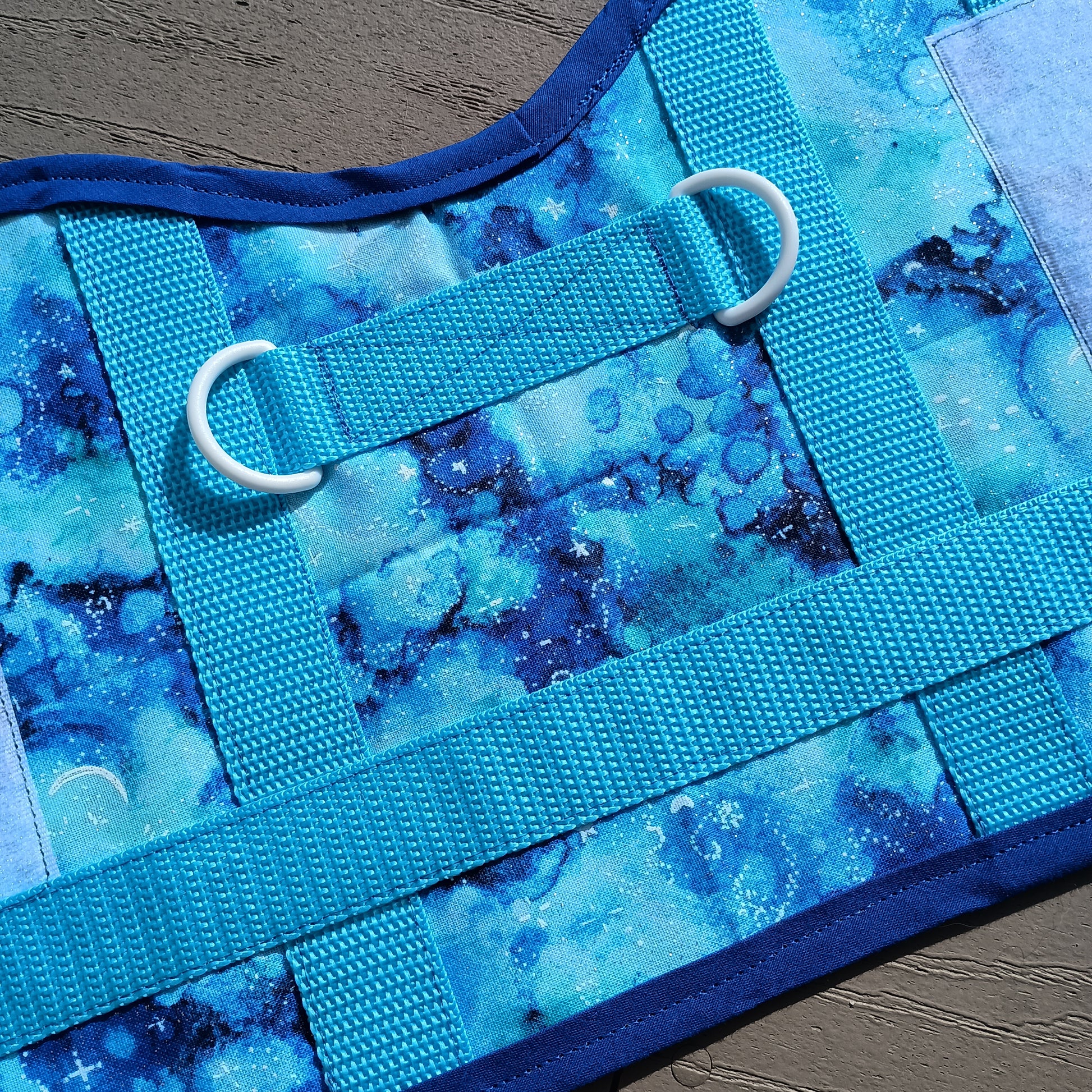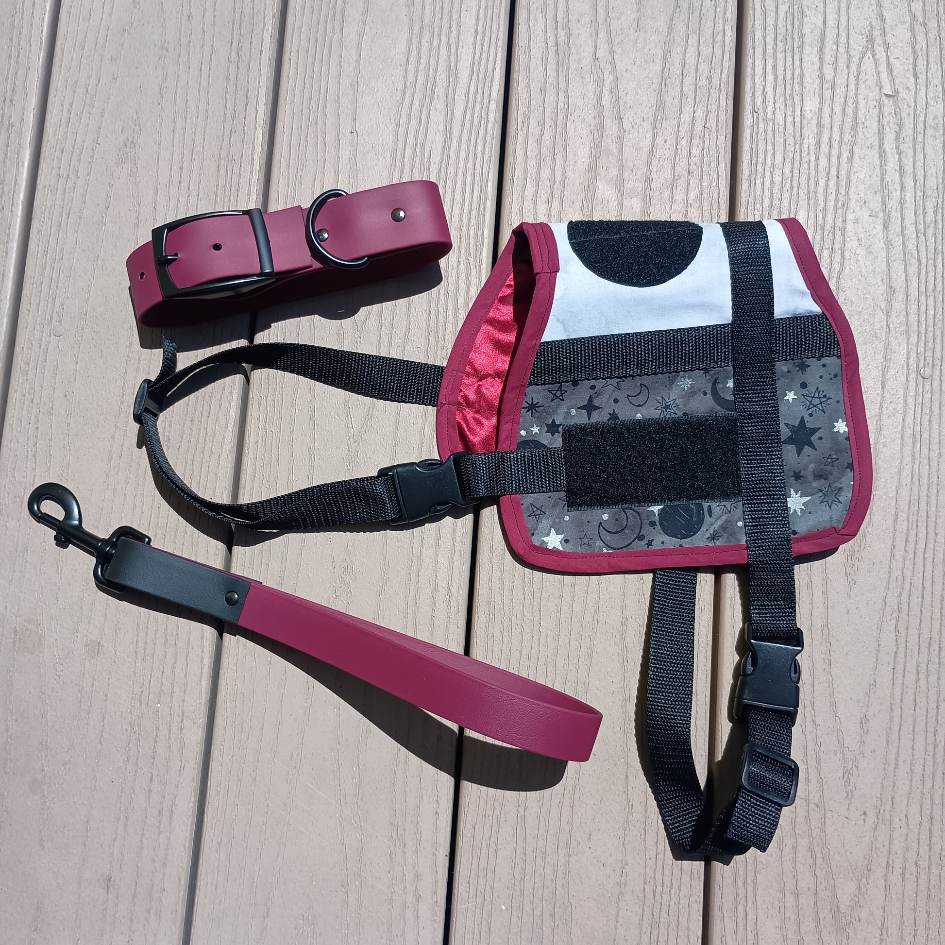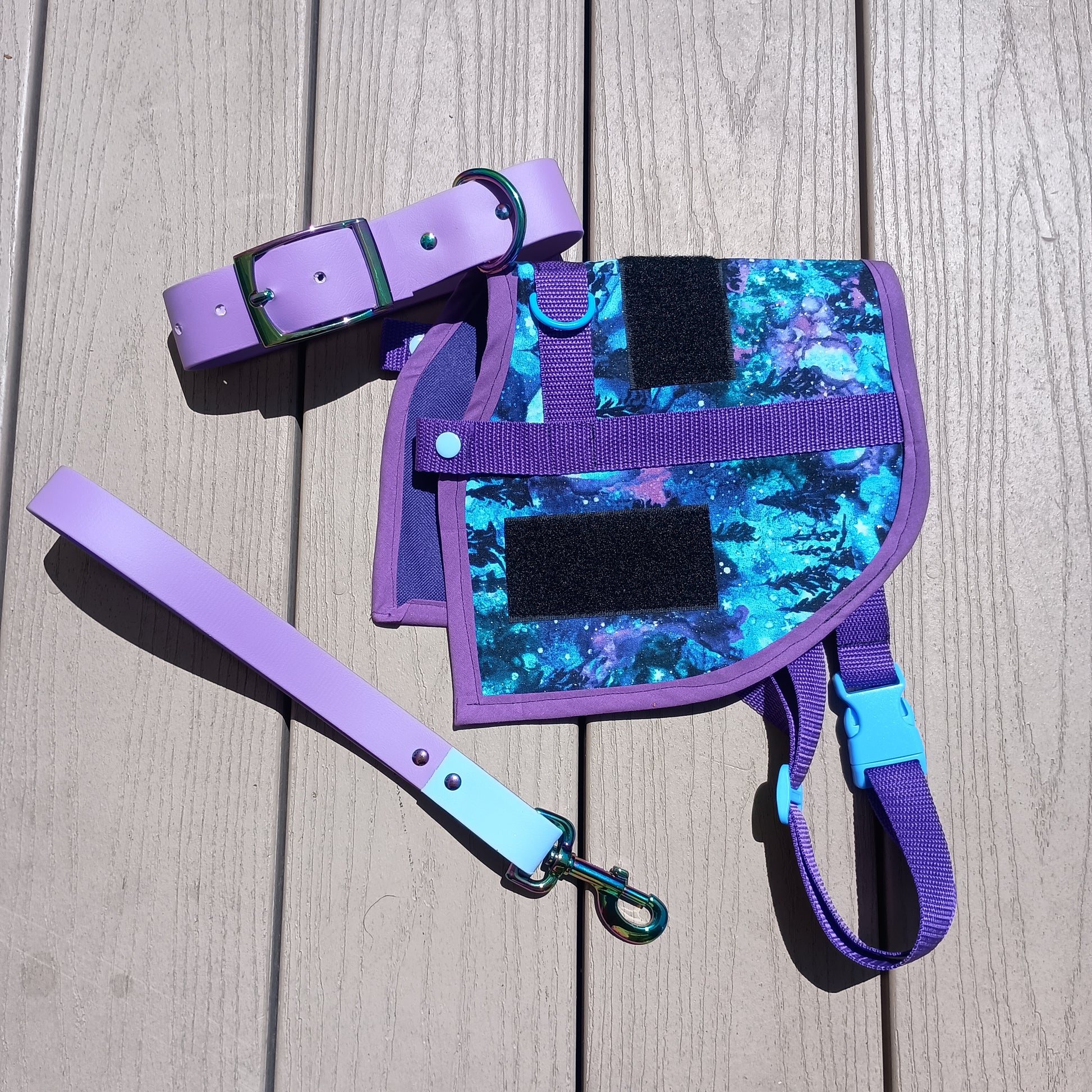 This is a complete set of matching gear that includes one simple vest or cape, one Biothane collar, and one Biothane leash. Add-ons for further personalization include a Biothane pull strap, a set of coordinating patches, reflective accents, and pockets for an additional cost.